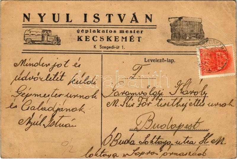 1942 Nyul István géplakatos mester reklámlapja. Kecskemét, K. Szegedi ... https://www.darabanth.com/de/457-Fernauktion/457.0/Ansichtskarten/Werbungen~1000045/1942-Nyul-Istvan-geplakatos-mester-reklamlapja-Kecskemet-K-Szegedi-ut-1-EB~II3060328