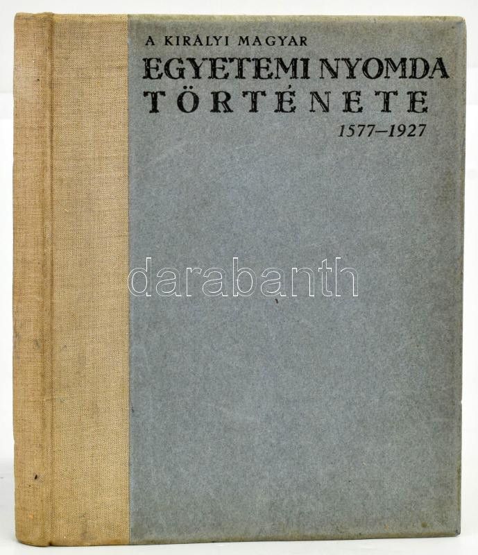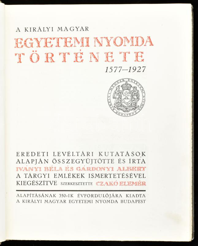 A Királyi Magyar Egyetemi Nyomda története 1577-1927. Eredeti levéltári kutatások alapján összegyűjtötte és írta: Iványi Béla és Gárdonyi Albert. A tárgyi emlékek ismertetésével kiegészítve szerkesztette: Czakó Elemér. Bp., 1927., Kir. M. Egyetemi Nyomda, 202+2 p. Gazdag képanyaggal illusztrált. Kiadói félvászon-kötésben, a borító kopásnyomokkal.