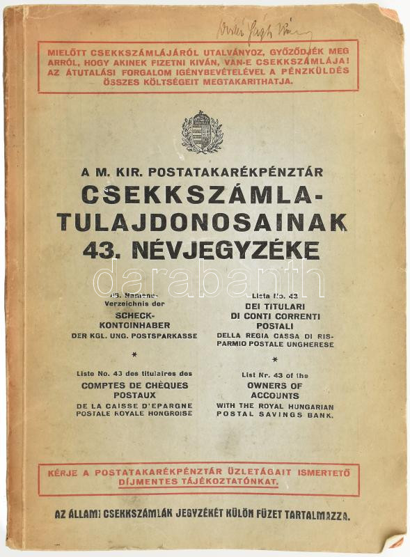 A M. Kir. Postatakarékpénztár csekkszámlatulajdonosainak 43. névjegyzé... https://www.darabanth.com/de/457-Fernauktion/457.0/Bucher/Bucher-Andere-kuriositaten~1500037/A-M-Kir-Postatakarekpenztar-csekkszamlatulajdonosainak-43-nevjegyzeke-Bp-1940-M-Kir~II2914093
