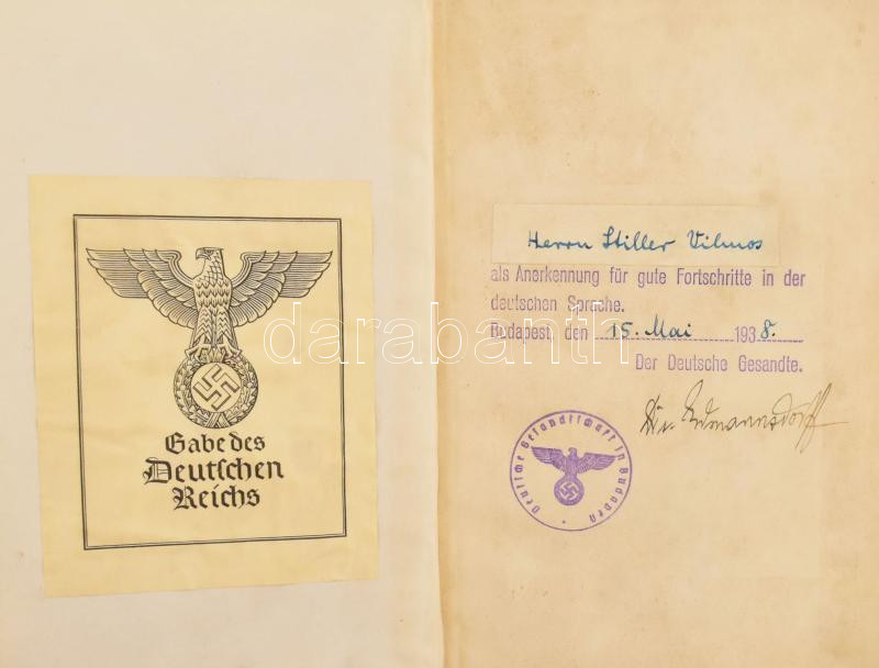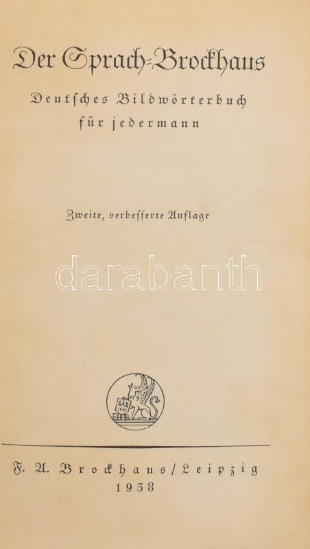 Der Sparch-Brockhaus. Deutsches Bildwörterbuch für jedermann. Leipzig, 1938. Brockhaus. Kiadói vászonkötésben. A budapesti német nagykövetség ajándékozási bejegyzésével és ex librisével