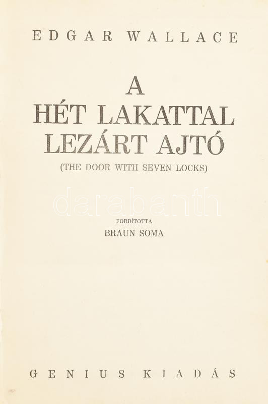 Edgar Wallace: A hét lakattal lezárt ajtó. (The door with seven locks. Ford.: Braun Soma. Bp., én., Genius. Átkötött félvászon-kötés. Edgar Wallace (1875-1932) a kiváló angol krimi író.