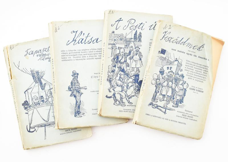 [Gárdonyi Géza]: 4 db Göre Gábor könyv: Veszödelmek, más szóval nem matska ugrás ide Amerika se [...]; A pesti úr; Kátsa; Tapasztalatok. Bp., 1923, Dick Manó ("Globus"-ny.) Mühlbeck Károly illusztrációival. Kiadói papírkötés, vegyes, sérült állapotban.