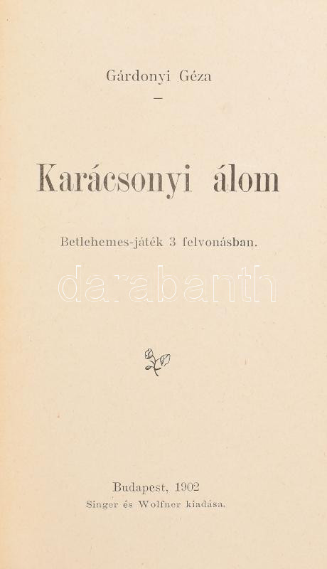 Gárdonyi Géza: Karácsonyi álom. Bp., 1902, Singer és Wolfner. Első kia... https://www.darabanth.com/de/457-Fernauktion/457.0/Bucher/Bucher-Andere-kuriositaten~1500037/Gardonyi-Geza-Karacsonyi-alom-Bp-1902-Singer-es-Wolfner-Elso-kiadas-Kiadoi-aranyozott~II3060171