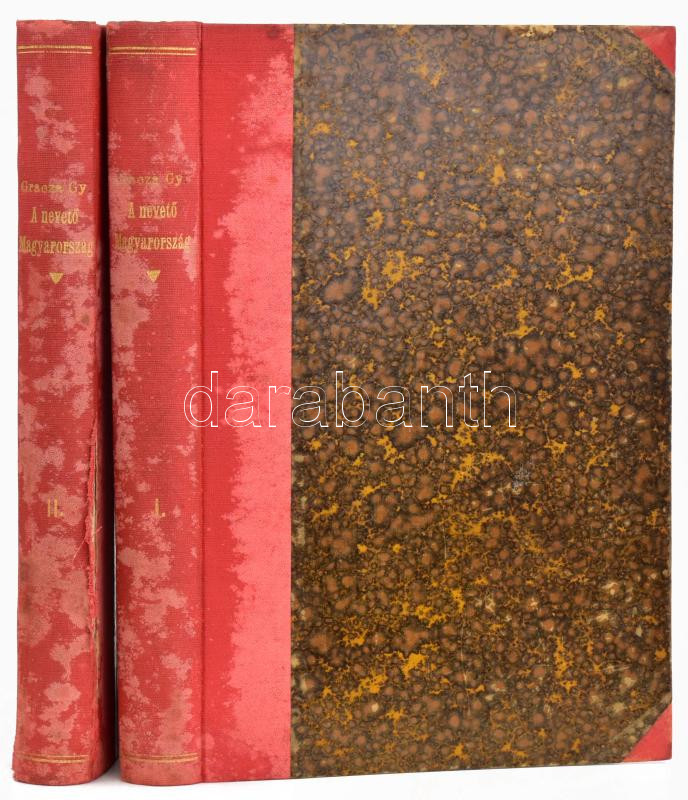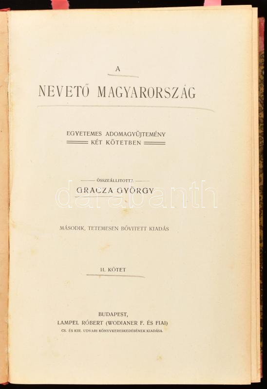 Gracza György: A nevető Magyarország I-II. köt. Egyetemes adomagyűjtemény I-II. köt. Összeáll.: - -. Bp.,1901,Lampel R. (Wodianer F. és Fiai), 4+380 p.+5 t.; 4+371 p.+7 t. Egészoldalas képtáblákkal, és oldalszámozáson belül egészoldalas illusztrációkkal. Átkötött kopott, foltos félvászon-kötés, a II. kötet gerince sérült, de ezt leszámítva belül jó állapotban.