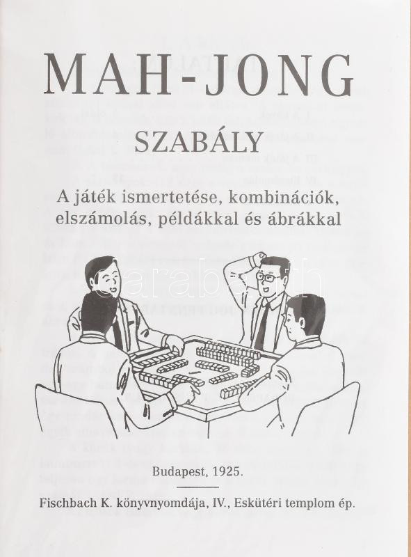 Hergár Emil: Mah-jong szabály. Terebess, Budapest, 1997. Az 1925-ös Fi... https://www.darabanth.com/de/457-Fernauktion/457.0/Bucher/Bucher-Andere-kuriositaten~1500037/Hergar-Emil-Mah-jong-szabaly-Terebess-Budapest-1997-Az-1925-os-Fischbach-K-kiadas-reprint-~II3038462