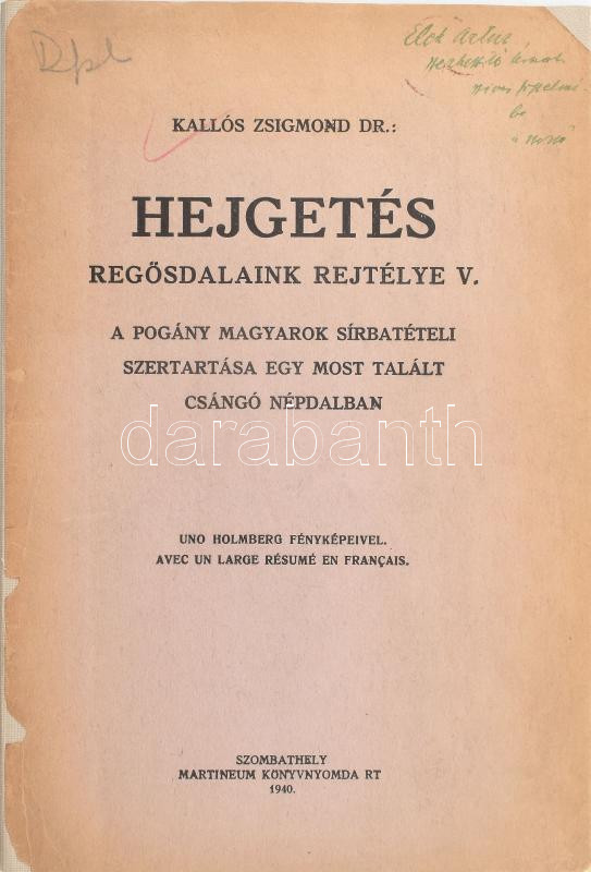 Kallós Zsigmond: Hejgetés. A pogány magyarok sírbatételi szertartása egy most talált csángó népdalban. (DEDIKÁLT). Regősdalaink rejtélye V. Szombathely, 1940, Martineum Könyvnyomda Rt., 31 p. Első kiadás. Papírkötésben, javított borítóval, belül jó állapotban. A szerző, Kallós Zsigmond (1876-1955) irodalomtörténész, etnográfus által Elek Artúr (1876-1944) író, műfordító, művészettörténész részére DEDIKÁLT példány.