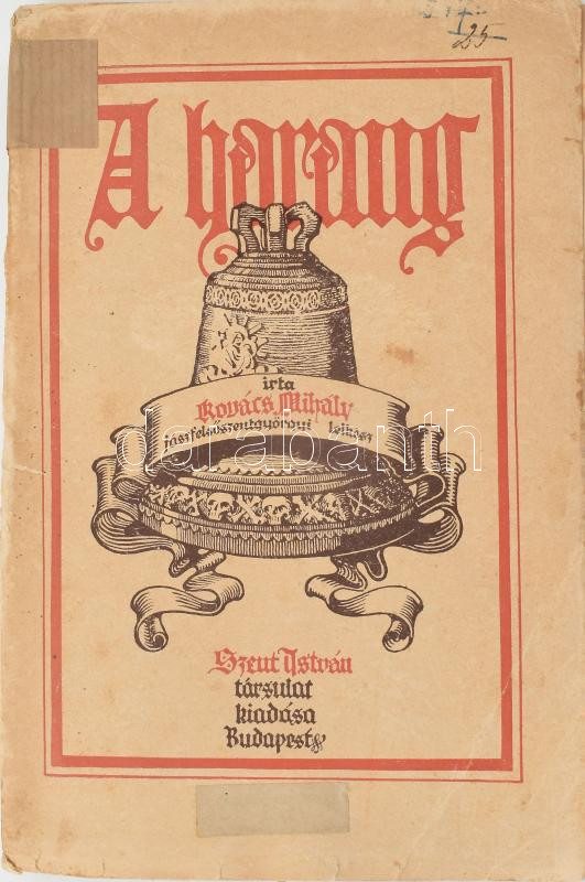 Kovács Mihály: A harang. Bp., 1919, Szent István-Társulat. Kiadói papírkötés, kissé foltos borítóval, kissé szakadozott borítószélekkel, volt könyvtári példány.