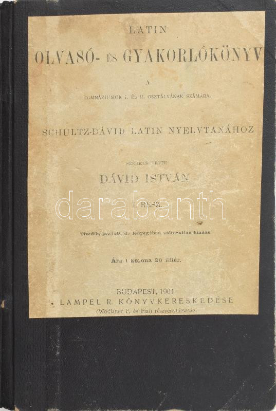 Latin olvasó- és gyakorlókönyv a gimnáziumok I. és II. osztályának számára. Schultz-Dávid latin nyelvtanához. Szerk.: Dávid István. I. rész. Bp., 1904, Lampel R. (Wodianer F. és Fiai) Rt. Latin és magyar nyelven. Fekete-fehér illusztrációkkal. Átkötött félvászon-kötés, kissé kopott borítóval, egy lap javított (129/130.), ceruzás bejelölésekkel.