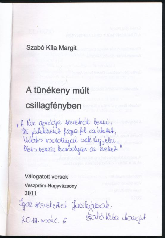 Szabó Kila Margit: A tünékeny múlt csillagfényben. Válogatott versek. Veszprém-Nagyvázsony, 2011, Viza Kft. Kiadói papírkötés. A szerző által DEDIKÁLT példány.