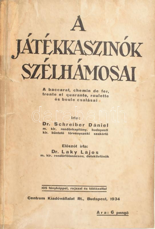[Tartsányi] Schreiber Dániel: A játékkaszinók szélhámosai. A baccarat, chemin de fer, trente et quarante, roulette és boule csalásai. Dr. Laky Lajos elÅ‘szavával. Bp., 1934, Centrum Kiadóvállalat Rt., 199+(1) p. ElsÅ‘ kiadás. Szövegközi illusztrációkkal. Kiadói papÃrkötés, kissé viseltes, foltos borÃtóval, néhány kisebb lapszéli folttal.