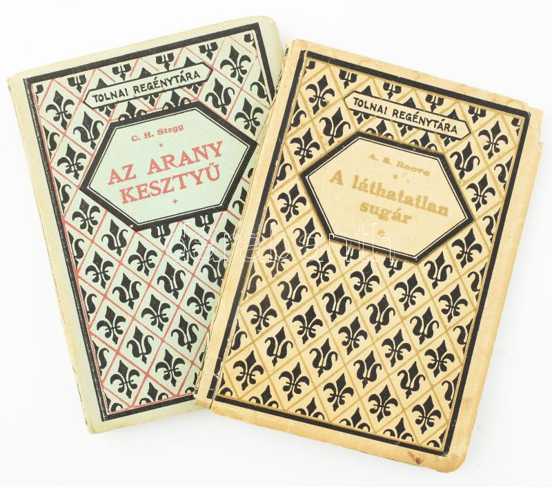 Tolnai Regénytára 2 kötete: A. B. Reeve: A láthatatlan sugár.; C. H. Stagg: Az aranykesztyű. Bp., [1927-1929], Tolnai, 126+(2) p.; 127+(1) p. Kiadói papírkötés, kisebb sérülésekkel, az egyik kötet címlapja szakadt, hiányos.