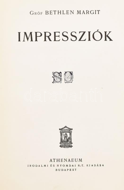 gróf Bethlen Margit: Impressziók. Bp.,én., Athenaeum. Kiadói aranyozot... https://www.darabanth.com/de/457-Fernauktion/457.0/Bucher/Bucher-Andere-kuriositaten~1500037/grof-Bethlen-Margit-Impressziok-Bp-en-Athenaeum-Kiadoi-aranyozott-egeszvaszon-kotes-k~II2909969