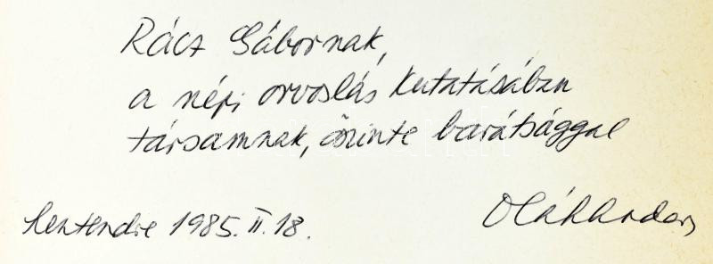 Oláh Andor: ,,Fűbe fába az orvosság!" (Békés megyei népi orvoslás). I.-II. kötet. (Egybekötve) I. kötet: A Mirigy hét lánya, hét fia és hetvenhét unokája. (A népi orvoslás értelmezése, jellemzése). II. kötet: Adat-tár. (Békéscsaba, 1983. Békés megyei Tanács V. B. - Szegedi ny.). 195 p., 290+(2) p.+15 sztl. lev.(46 t) Megjelent 2000 példányban! Kiadói, keménytáblás, illusztrált papírkötésben, eredeti, illusztrált papírborítóval apró szakadással. DEDIKÁLT példány