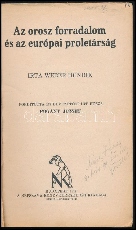 [Bauer, Otto] Weber Henrik: Az orosz forradalom és az európai proletárság. Ford. és bevezetést írt hozzá: Pogány József. Bp., 1917, Népszava (Világosság-ny.), 61+(3) p. Kiadói tűzött papírkötés, kissé sérült, foltos borítóval, belül nagyrészt jó állapotban.