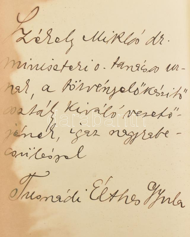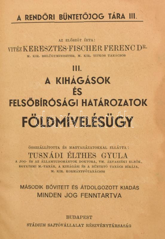 dr. Tusnádi Élthes Gyula (szerk.): A kihágások és felsőbirósági határozatok földmivelésügy. A rendőri bűntetőjog tára III. Az előszót írta Vitéz Dr. Keresztes-Fischer Ferenc. A szerkesztő, Tusnádi Élthes Gyula (1885-1957) jogtudományi szakíró, egyetemi tanár által Székely Miklós miniszteri osztálytanácsos, későbbi népjóléti államtitkárnak DEDIKÁLT! Bp., [1939], Stádium Sajtóvékkakat Rt., 1040 p. Második, bővített és átdolgozott kiadás. Kiadói kopottas egészvászon-kötés, foltos borítóval és lapokkal.