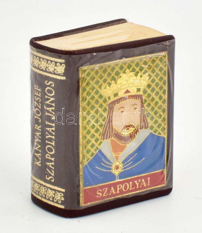 Kanyar József: Szapolyai János, az utolsó nemzeti király. (Minikönyv). Bp., 1993, Pátria Nyomda. Kiadói műbőr-kötés, a borítón zománcozott fém plakettel, kis ázásnyomokkal. Számozott (529./750) példány.