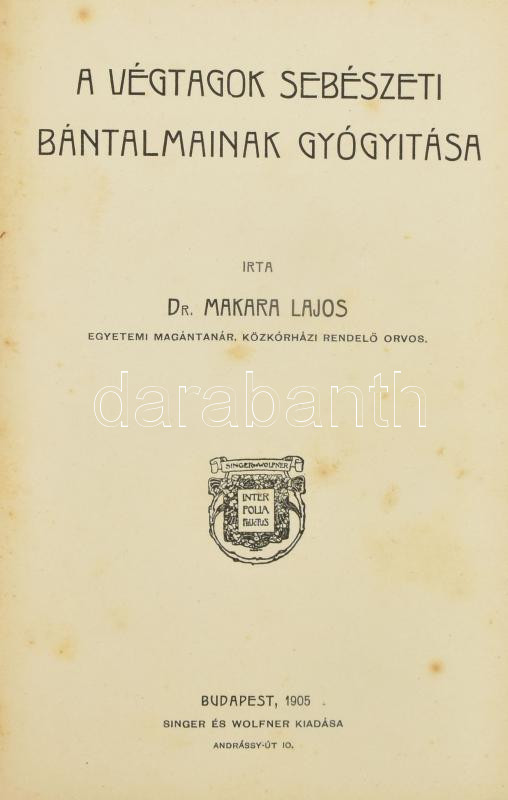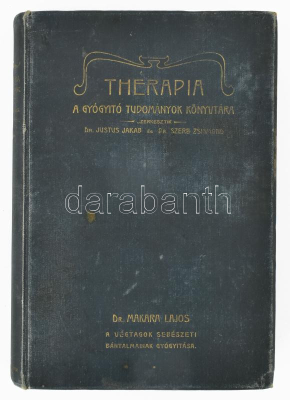 Makara Lajos: A végtagok sebészeti bántalmainak gyógyítása.Therapia,a gyógyító tudományok könyvtára VIII. köt. Bp., 1905, Singer és Wolfner, 4+276+20 p. Szövegközti illusztrációkkal. Korabeli reklámokkal. Kiadói aranyozott egészvászon-kötés, Leszik-kötés, festett lapélekkel, kopott borítóval, foltos lapokkal.