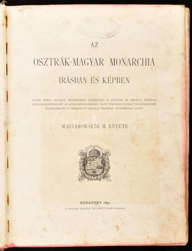 Az Osztrák-Magyar Monarchia írásban és képben. VII. Magyarország II. köt.: Az Alföld. Bp., 1891, Magyar Királyi Államnyomda, XIV+656 p. Nagyon gazdag egészoldalas és szövegközti képanyaggal, többek közt Mednyánszky László, Feszty Árpád, Munkácsy Mihály illusztrációival. Kiadói dúsan aranyozott, festett egészvászon-kötés, Gottermayer-kötés, intézményi bélyegzőkkel, kopottas, foltos kötésben, foltos lapokkal, néhány lap kijár.