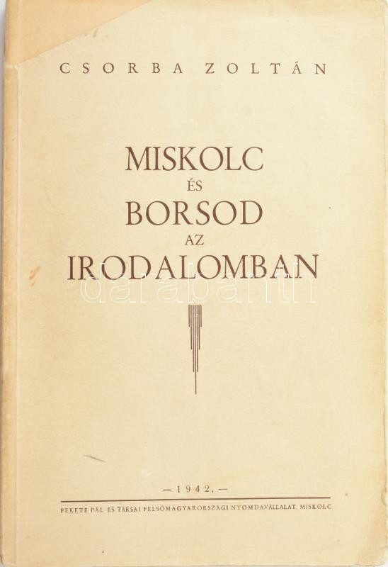 Csorba Zoltán: Miskolc és Borsod az irodalomban. Miskolc, 1942, a szerző kiadása (Fekete Pál és Társai-ny.), 160 p. Kiadói papírkötés; hiányos, foltos borítóval, kijáró lapokkal.