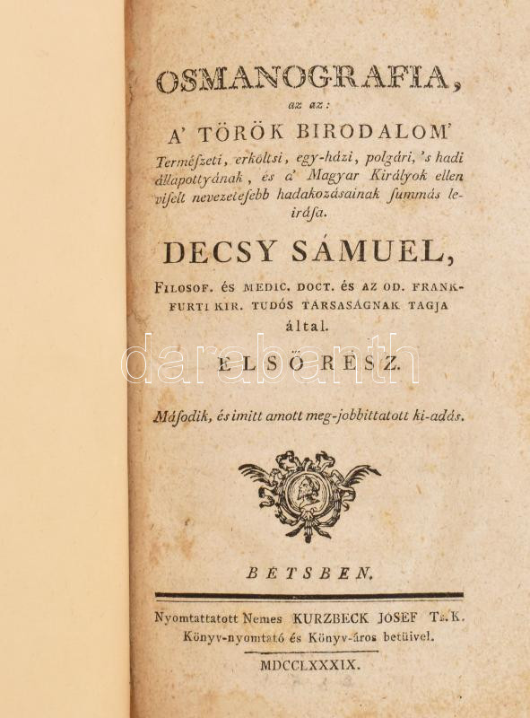 Decsy Sámuel: Osmanografia, az az: a' Török Birodalom' Természeti, erköltsi, egy-házi, polgári, 's hadi állapottyának, és a' Magyar Királyok ellen viselt nevezetesebb hadakozásinak summás leirása. Első rész. Bétsben, 1789, Kurtzbeck Jósef, (24)+396+(20) p. Második, és imitt amott meg-jobbittatott ki-adás. Átkötött félbőr-kötésben, helyenként sérült, kissé foltos lapokkal, néhány lapszéli hiánnyal, a hibajegyzék hiányzik.