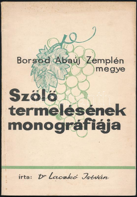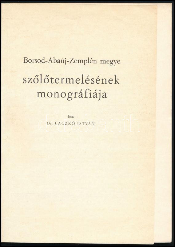 Dr. Laczkó István: Borsod-Abaúj-Zemplén megye szőlőtermelésének monográfiája. (Miskolc, 1964, Borsod megyei Nyomdaipari Vállalat), 80 p. Fekete-fehér képekkel illusztrálva. Kiadói papírkötés, a borítón apró foltokkal. Megjelent 1200 példányban.