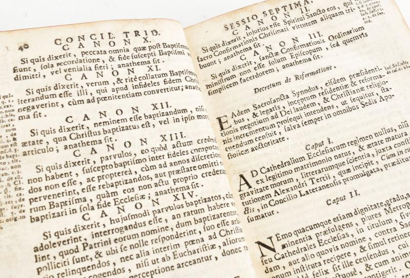 Sacrosancti Concilii Tridentini canones et decreta, cum citationibus ... ab Horatio Lucio ... collectis. - Bassani, 1733 J.Antonius Remondinus, 350p. + hozzákötve: Index Librorum Prohibitorum (Tilltott könyvek jegyzéke) Bassani 1733. 72 p. Korabeli félbőr kötésben néhány bejegyzéssel és pecsételt ex librissel