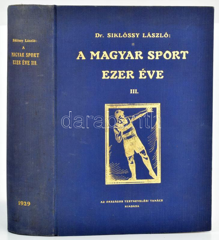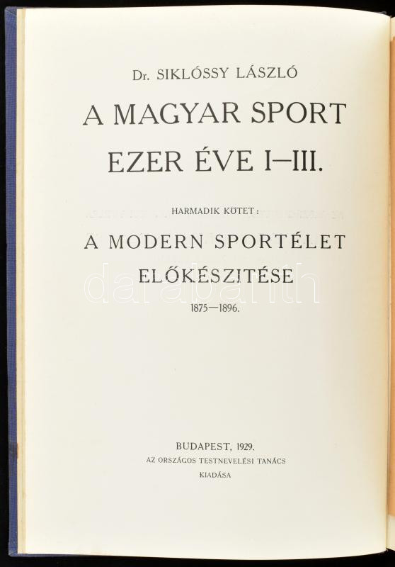Siklóssy László: A magyar sport ezer éve III. köt.: A modern sportélet előkészítése. 1875-1896. Bp., 1929., Országos Testnevelési Tanács. Kiadói aranyozott egészvászon-kötés, apró folttal a hátsó borítón. + 1924 Budapesti (Budai) Torna-Egylet prospektusa, 3 sztl. lev.