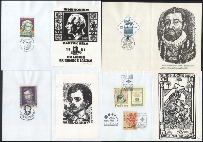 Beschreibung: 5 db halmozott grafika: ex libris, bélyeg, bélyegzés azonos témában. közötte Petőfi, Kodály, stb