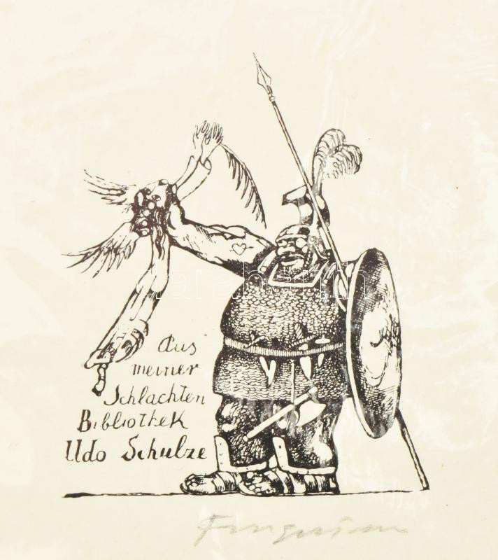 Beschreibung: Michel Fingesten (1884-1943): Aus meiner Schlachtenbibliothek Udo Schulze (ex libris). Klisé, papír, jelzett, 8x6,5 cm