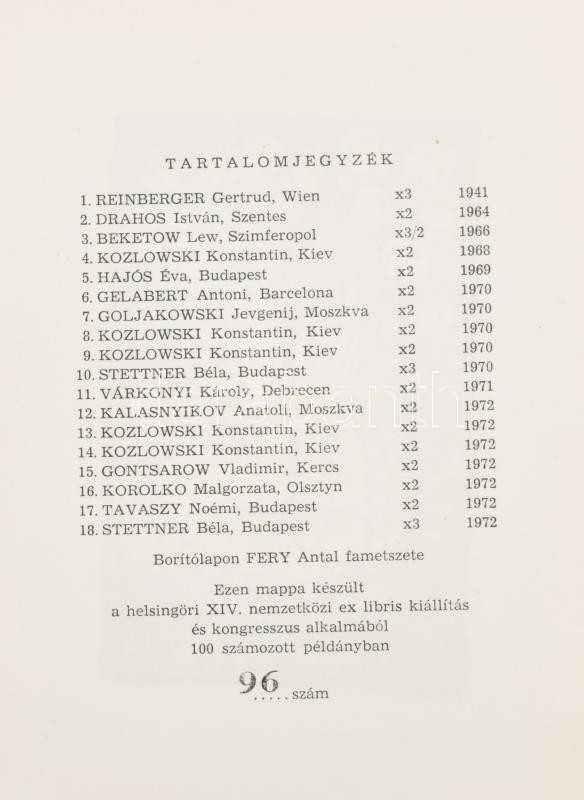 Beschreibung: Réthy István ex libris philately 18 db ex libris: Drahos, Stettner, Korolko, Tavaszy Noémi.Linómetszetek sorszámozott 96/100