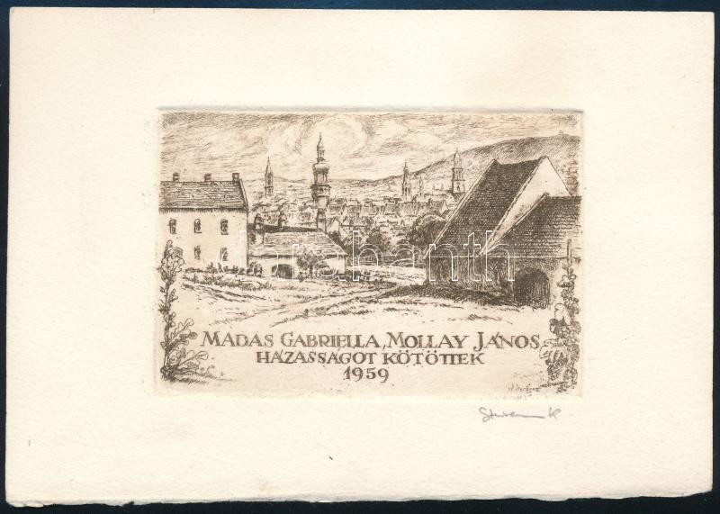 Sterbenz Károly (1901-1993): Ex libris "Madas Gabriella, Mollay János házasságot kötöttek 1959" A képen Sopron városa, 15x10,5 cm, a hátoldalon ragasztónyomokkal