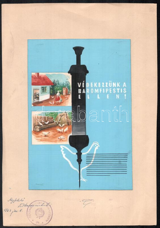 1963 Komjáti Ilona (?-?): "Baromfipestis ellen védekezz", vegyes technika, papír papíron, jelzés nélkül, bírált plakátterv a Magyar Hirdető részére, pecséttel, a hátoldalon jegyzettel, 20x14 cm