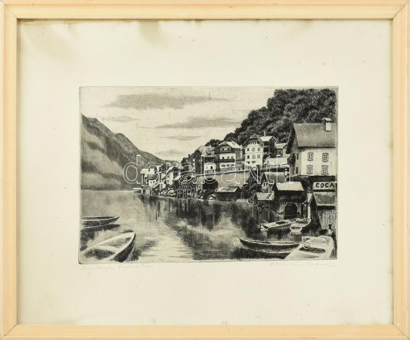 Beschreibung: Ábrahám Rafael (1929-2014): Dunakanyar Ausztriában. Rézkarc, papír, jelzett, üvegezett fakeretben, lapszéli apró foltokkal, 22×33,5 cm