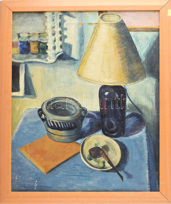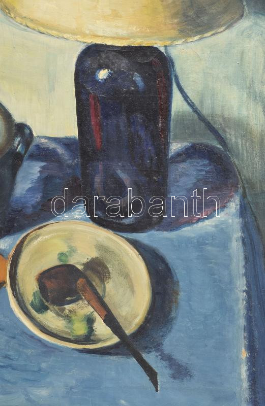 Bruhn Tvede, Alice (1906?-1970): Art deco csendélet (Stilleben). Olaj, vászon. Jelzés nélkül. Hátoldalán 1930 körüli kiállítási címkével. Sérült. Fakeretben. 58x47 cm / oil on canvas, unsigned, with old exhibition label on the reverse, damaged, framed