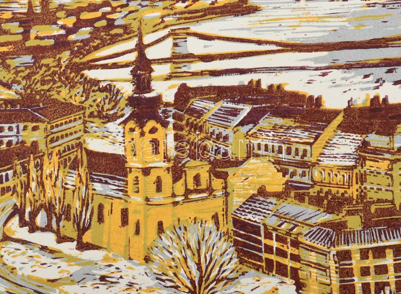 Beschreibung: Csavlek András (1942- ): Budapest. Színes linómetszet, papír, jelzett, 26×55 cm