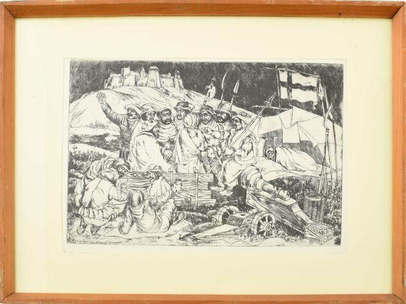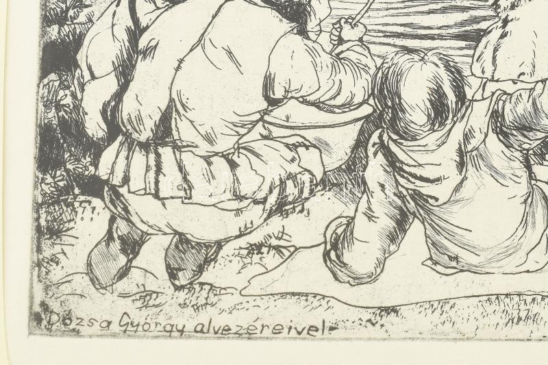 Beschreibung: Gácsi Mihály (1926-1987): Dózsa alvezéreivel. Rézkarc, papír , jelzett Üvegezett fakeretben, 20x30 cm