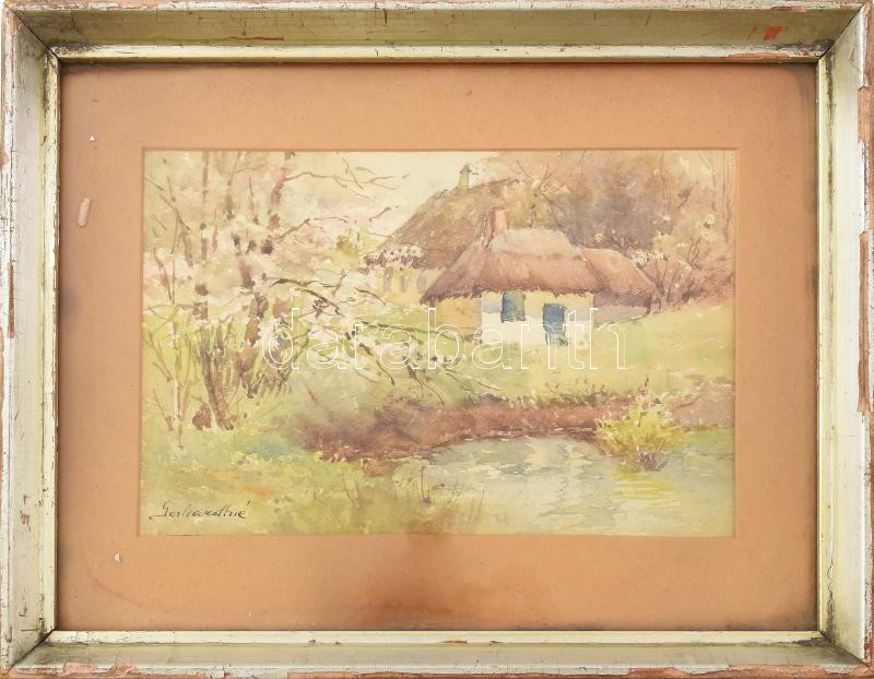 Beschreibung: Gerhardtné (?-?), működött a XIX. sz. végén/XX. sz elején: Vízparti táj. Akvarell, papír. Jelzett. Üvegezett, kissé sérült fakeretben. 14x22,5 cm