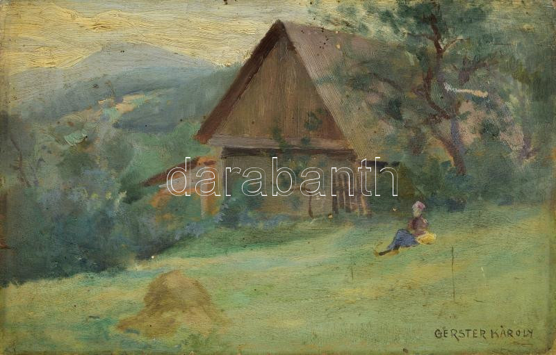 Gerster Károly (1859-1940): Pihenő. Olaj, falemez. Jelzett. Hátoldalán Szépművészeti Múzeum 1950 körüli bélyegzőjével. Apró felületi sérüléssel. 15x24 cm.