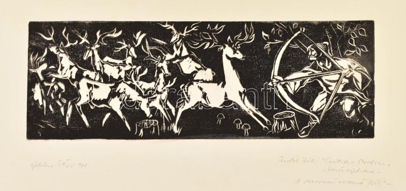 Beschreibung: Göldner Tibor (1929-): Bartók Béla, "Cantata - Profana". Linómetszet, papír, jelzett, kartonra kasírozva, 14,5x41 cm