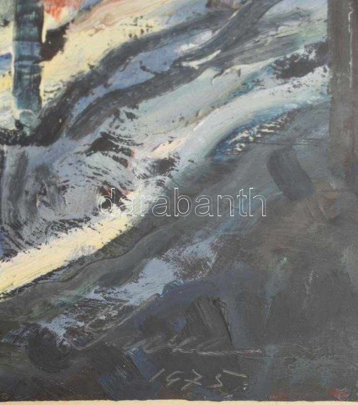 Beschreibung: Incze István (1905-1978): Bucsin útja télen (Erdély), 1975. Olaj, karton, jelezve balra lent, üvegezett fakeretben, 34,5×49 cm
