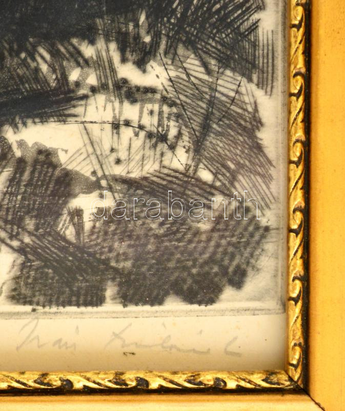 Beschreibung: Iván Szilárd (1912-1988): Dunaág. Rézkarc, papír, jelzett, üvegezett keretben, 29×38 cm