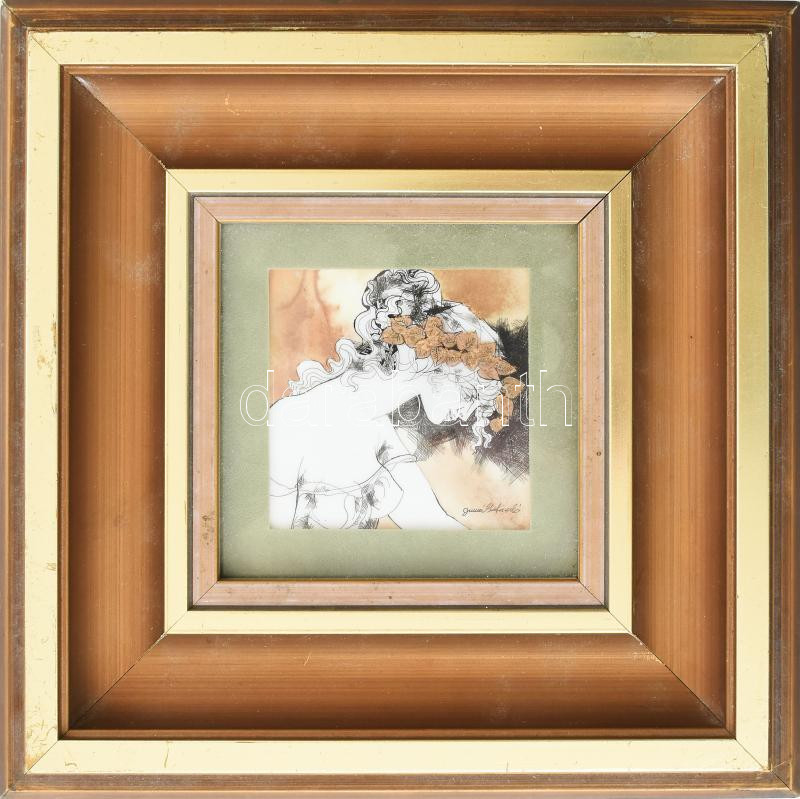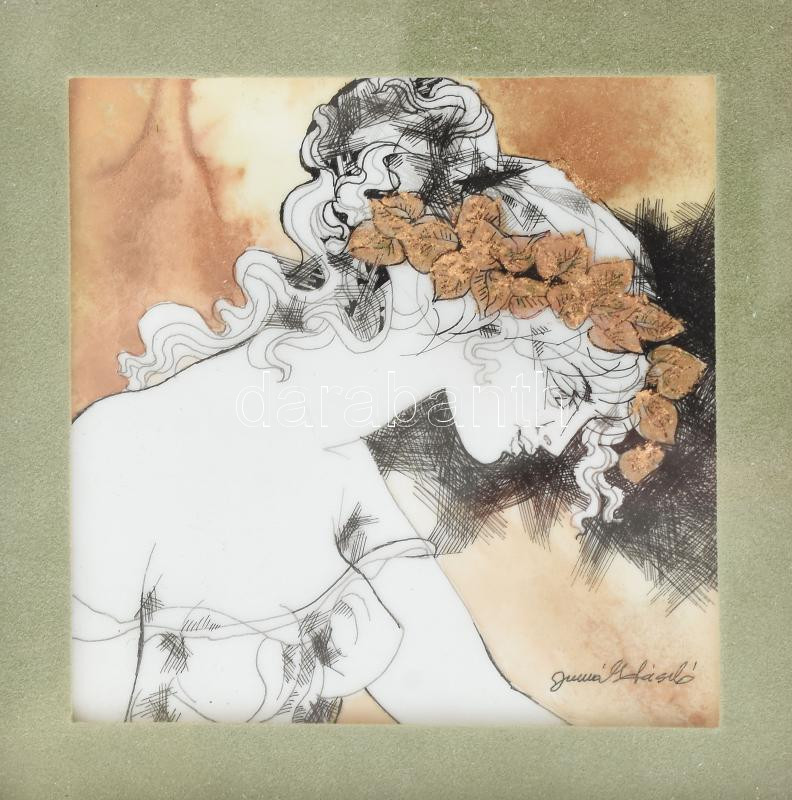 Beschreibung: Jurcsák László: Görög mondák. Vegyes technika, üvegezett fa keretben, hátoldalán a szerző aláírásával hitelesítve, 10x10 cm