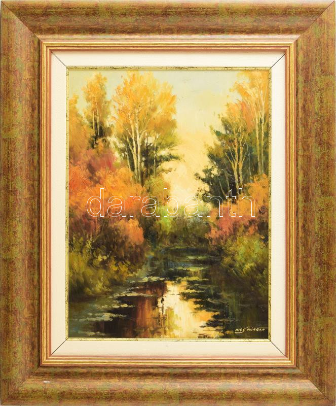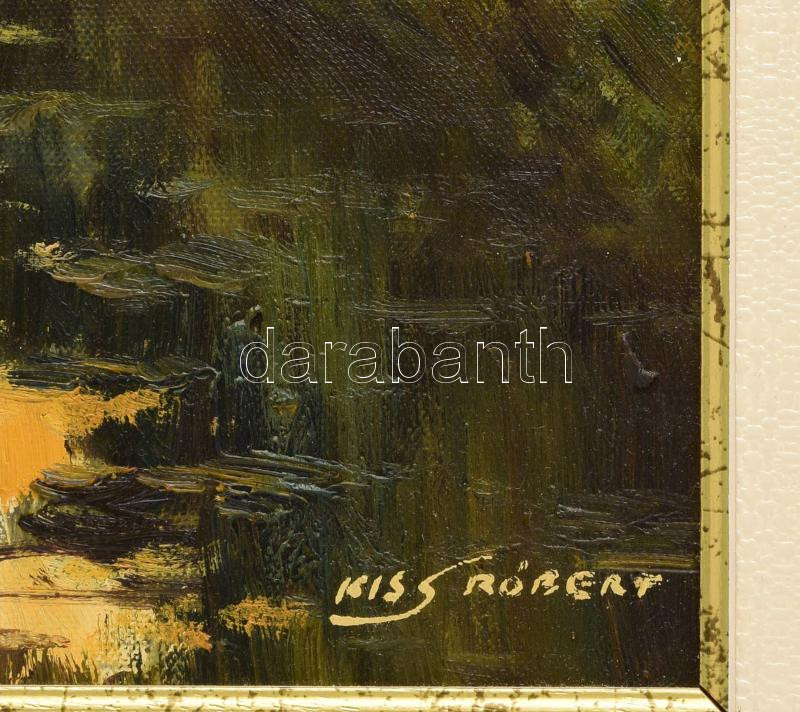 Beschreibung: Kiss Róbert (?-): Ősszel. Olaj, farost, jelzett. Dekoratív fakeretben, 40×30 cm