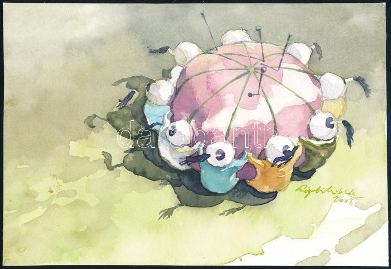 Beschreibung: Ligeti Miklós (1982-): Szürreális körtánc, 2008. Akvarell, papír, jelzett. 16x23 cm