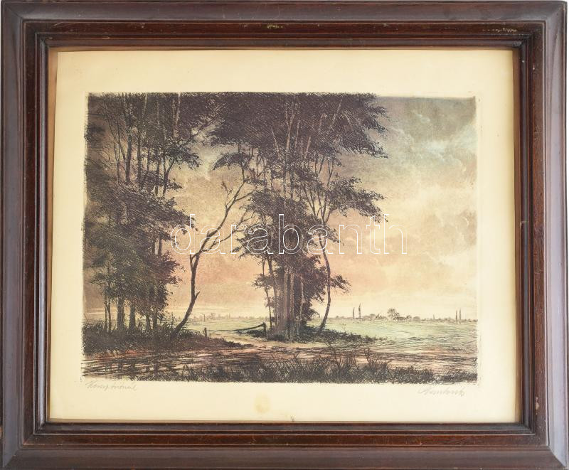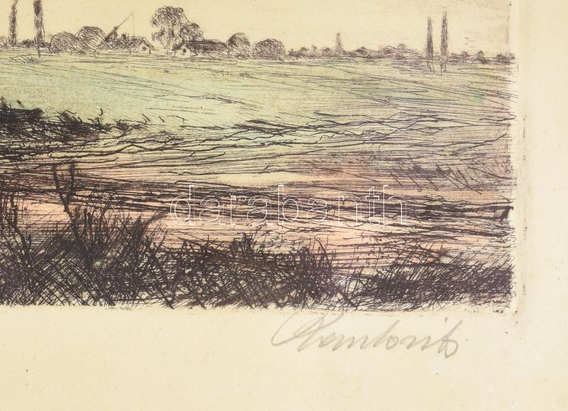 Beschreibung: Paulovits Pál (1892-1975): Keresztútnál. Színezett rézkarc, papír, jelzett. Üvegezett fakeretben, lapszéli kisebb folttal, 26×35 cm.