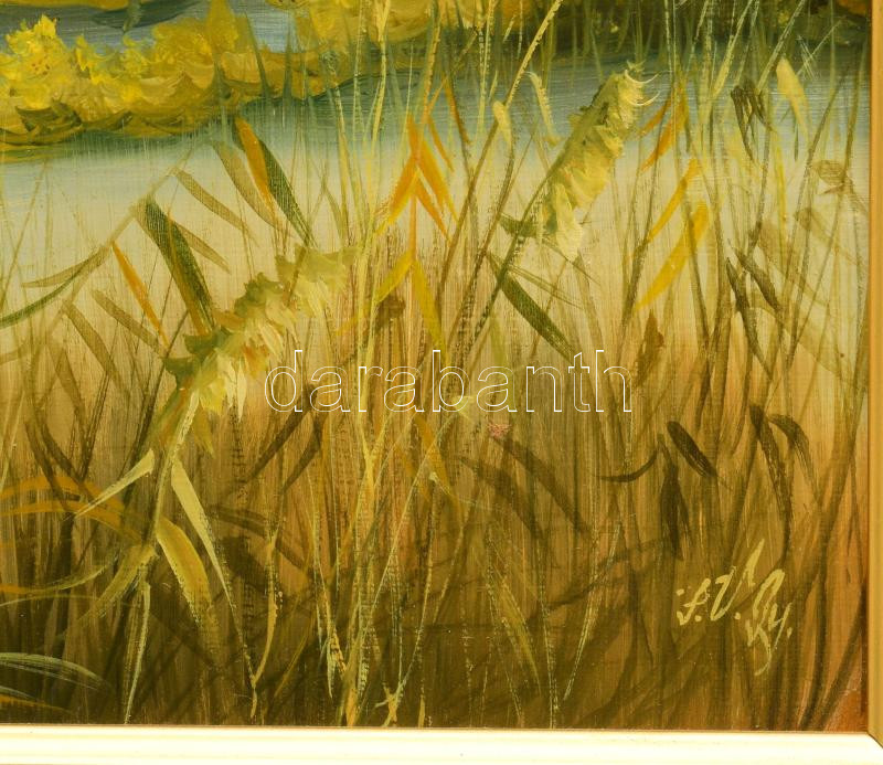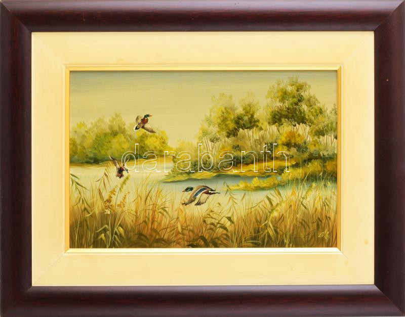 Beschreibung: Pethőné Varga Györgyi (1942-): Reppenés (vadkacsák). Olaj, farost, jelzett, hátoldalán címkén feliratozott. Dekoratív fakeretben, 20×30 cm