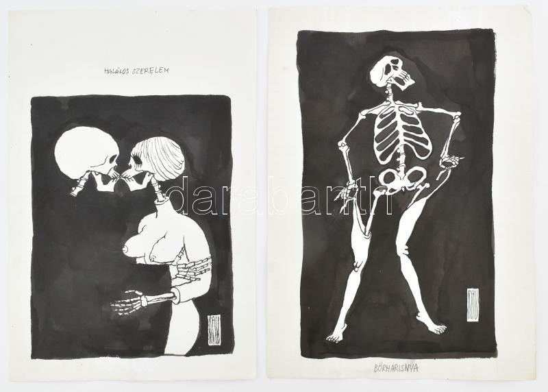 Beschreibung: Rau Tibor (1934-2000), 2 db karikatúra: Bőrharisnya és Halálos szerelem (erotikus karikatúra). Tus, papír, mindkettő jelzett. 30x21 és 30x20 cm