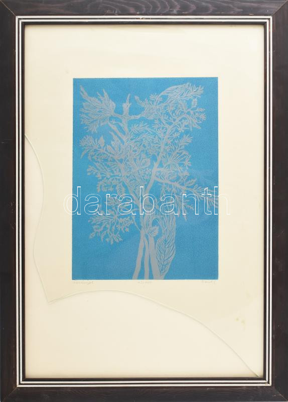 Beschreibung: Reich Gábor (1951-): Növények. Linómetszet, papír. Jelzett, sorszámozott 43/100 keretben törött üveggel. 24x36 cm