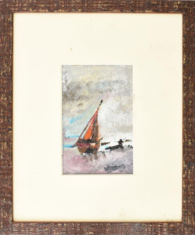 Beschreibung: Rubint Ávrahám Péter (1958-): Vitorlás, 2001. Olaj, karton, jelezve középen lent, fakeretben. 12,5×8 cm