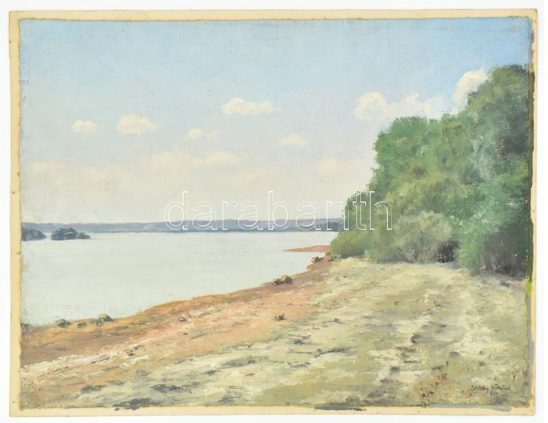 Beschreibung: Sárdy Brutus (1892-1970): Nagytétényi Dunapart, 1959. Olaj, vászon, jelezve jobbra lent, kartonra kasírozva, hátoldalán autográf felirattal, 38,5x52,5 cm